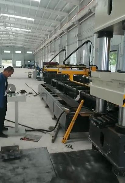 首先,客戶在采購原材料時,需要購買剪切好的長條板,根據錨桿托盤尺寸采購 ,然后由自動送料機抓取長條板,進入錨桿托盤液壓機的工作臺模具上,錨桿托盤液壓機滑塊快速下行,沖壓錨桿托盤一次成型。錨桿托盤模具帶有剪切功能,當錨桿托盤液壓機施加一定的壓力后,直接將板材剪切掉,同時并完成了,錨桿托盤的沖孔壓型等工藝。一次成型的錨桿托盤成品率高、速度快,適合沖壓一些尺寸較大、厚度較大的錨桿托盤。速度在一分鐘4塊左右。